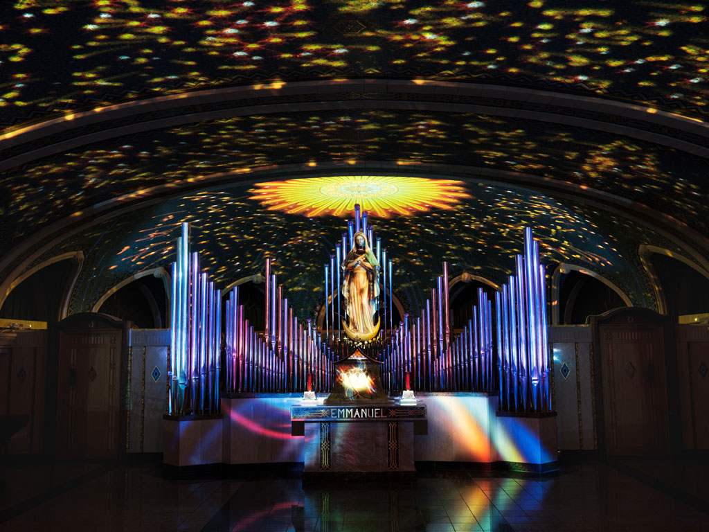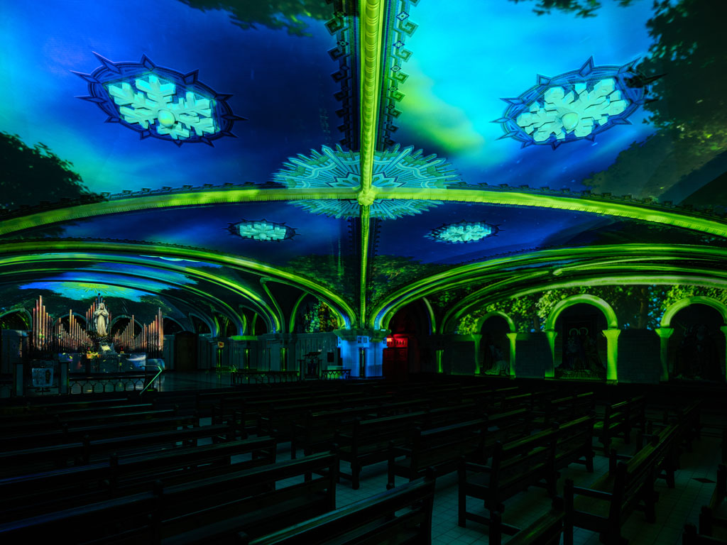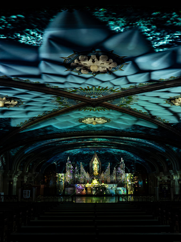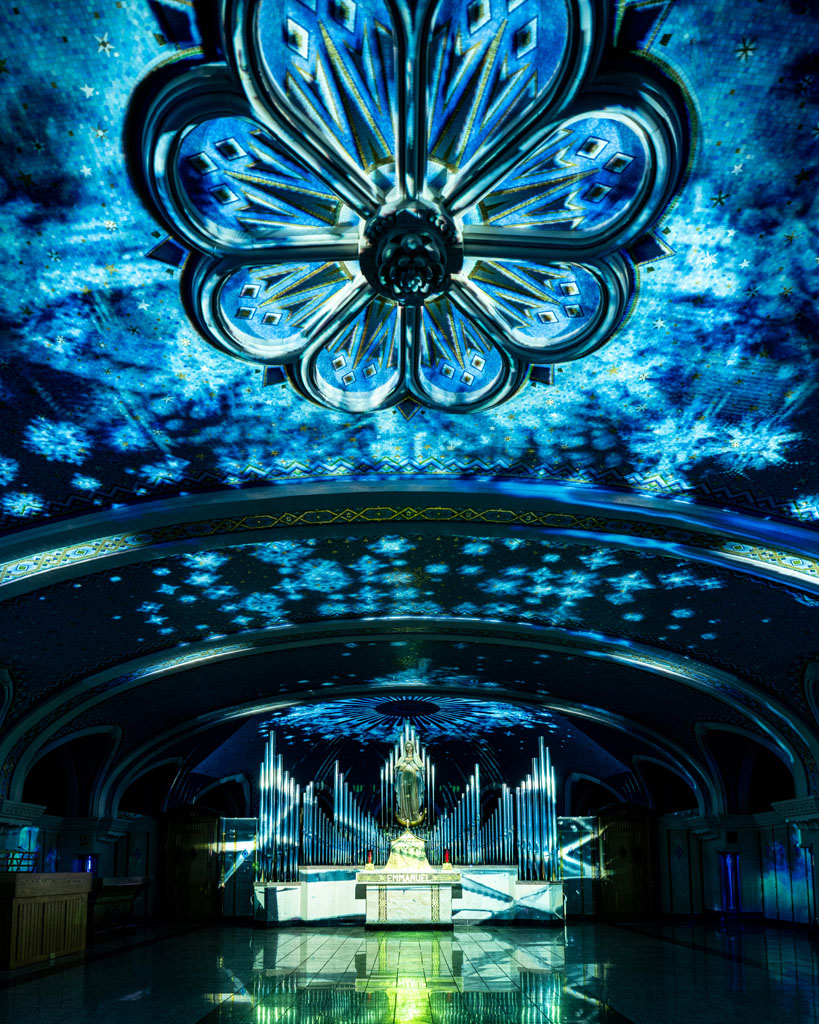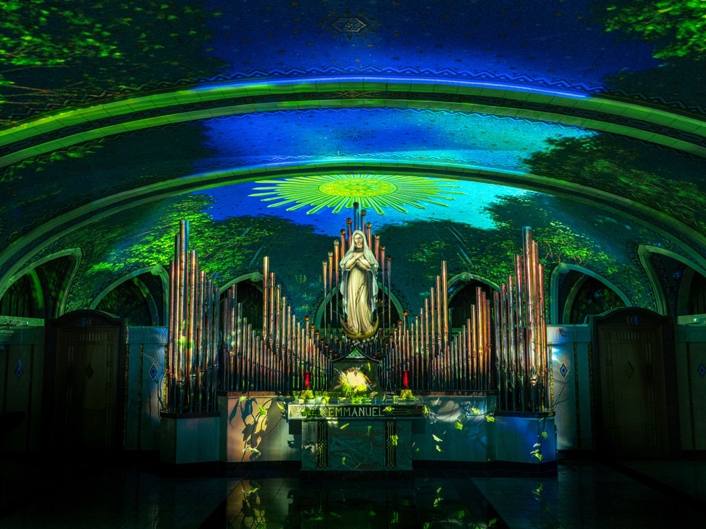 This unique creation by BADANG, an atelier from the Côte-de-Beaupré, transforms the blue chapel of the Basilica of Sainte-Anne-de-Beaupré into a captivating symphony of sight and sound.